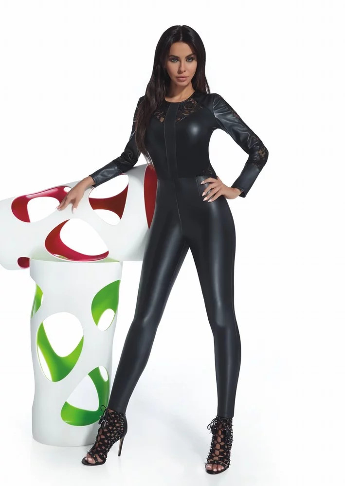 Tento sexi overal je vyrobený z ekokože a zvodnej čipky. Overal má okrúhly výstrih, dlhé rukávy a zapínanie na zips na chrbte. Na chrbte sú nášivky imitujúce vrecká. Mäkkosť: 200 DEN. materiál ECO-LEATHER imituje kožu, je plne krycí, pružný a modeluje postavu. Tento materiál je vyrobený z priadzí od renomovaných výrobcov s medzinárodným certifikátom Oeko-Tex. 100% polyester.