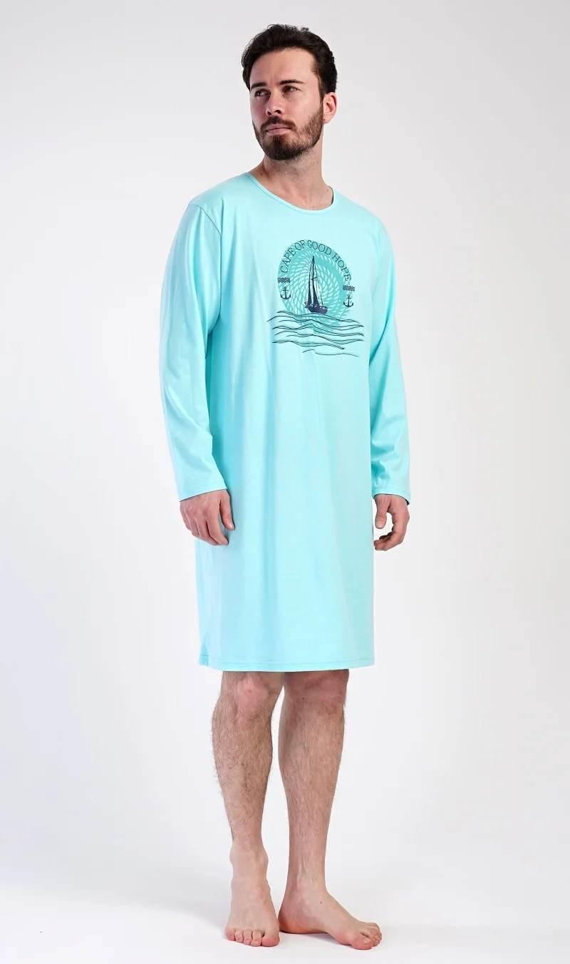 Pánska bavlnená nočná košeľa s dlhým rukávom Jachting. Jednofarebná pánska nočná košeľa s okrúhlym výstrihom a dĺžkou po kolená má na hrudi obrázok plachetnice a nápis "Mys dobrej nádeje". Nočná košeľa je vhodným darčekom pre všetkých milovníkov mora a diaľok. Použitý materiál zo 100 % bavlny je príjemný a pružný na dotyk. Pokyny na údržbu: - 100 % bavlna - možno prať v práčke pri teplote do 30 °C - nesušte v sušičke - žehliť na rubovej strane do 110° - nepoužívajte bieliace prostriedky - chemicky nečistiť Rozmery namerané na výrobku: 3111260000 Yachting M L XL XXL obvod hrudníka 114 120 126 132 dĺžka košele 110 110 110 110 dĺžka rukávov 65 65 65 65