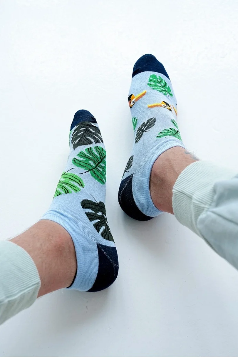 Exotika vo vašom šatníku - pánska obuv MILENA s tukanmi a listami Vneste do svojho každodenného štýlu tropickú atmosféru s pánskymi ponožkami MILENA 1108.040 s tukanmi a listami, ktoré sú nielen módne, ale aj funkčné pre každého muža, ktorý ocení pohodlie a originálny dizajn. Vysoký obsah bavlny zaručuje priedušnosť, zatiaľ čo vďaka prídavku elastanu a polyamidu sú ponožky pružné, priliehavé a odolné. Ideálne na teplé dni a ideálne k teniskám, teniskám a športovej obuvi.