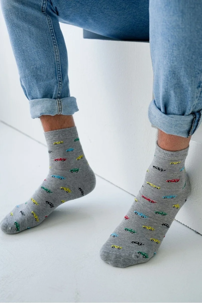 Pánske 3/4 ponožky Colorful Cars 1153.039 sú jedinečným doplnkom pre mužov, ktorí ocenia pohodlie a originálny štýl. Sú vyrobené z kvalitnej bavlny (75 %), sú mäkké, priedušné a príjemné na pokožku, čo zaručuje pohodlie počas celého dňa. Prídavok polyamidu (20 %) a elastanu (5 %) zaručuje pružnosť a odolnosť materiálu. Ponožky zdobia farebné motívy áut, ktoré im dodávajú charakter a robia z nich skvelý prvok každodenného stylingu. Sú ideálne na každodenné nosenie - do práce aj na voľný čas..