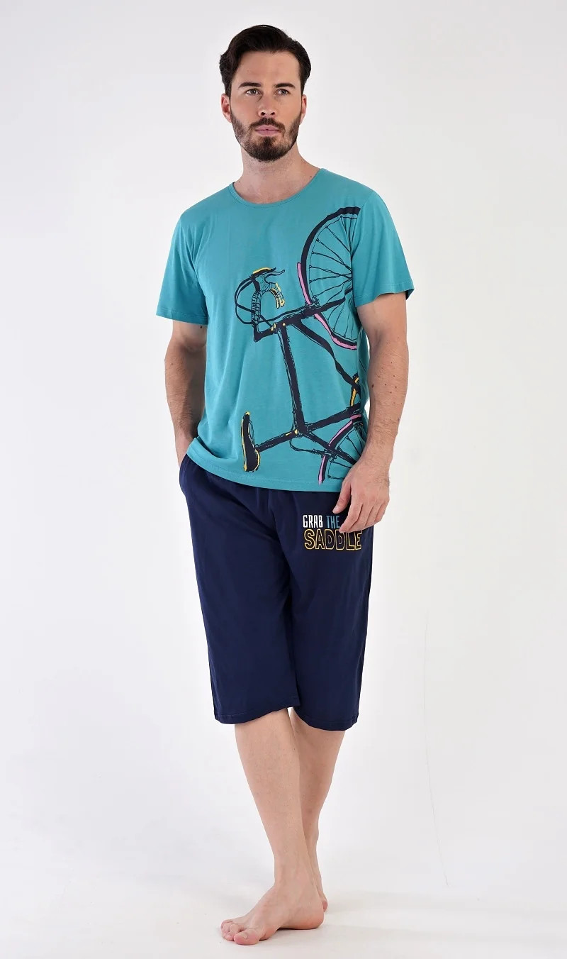 Pánske bavlnené pyžamo pánske pyžamo pozostáva z trička s krátkym rukávom a nohavíc s dĺžkou po kolená jednofarebné tričko zdobené výrazným obrázkom bicykla nohavice majú elastický pás, šnúrku na stiahnutie a praktické vrecká Materiálové zloženie: 100 % bavlna L XL XXL obvod hrudníka 110 114 118 dĺžka trička 78 78 78 pás 88-100 92-104 96-108 dĺžka nohavíc 66 67 68