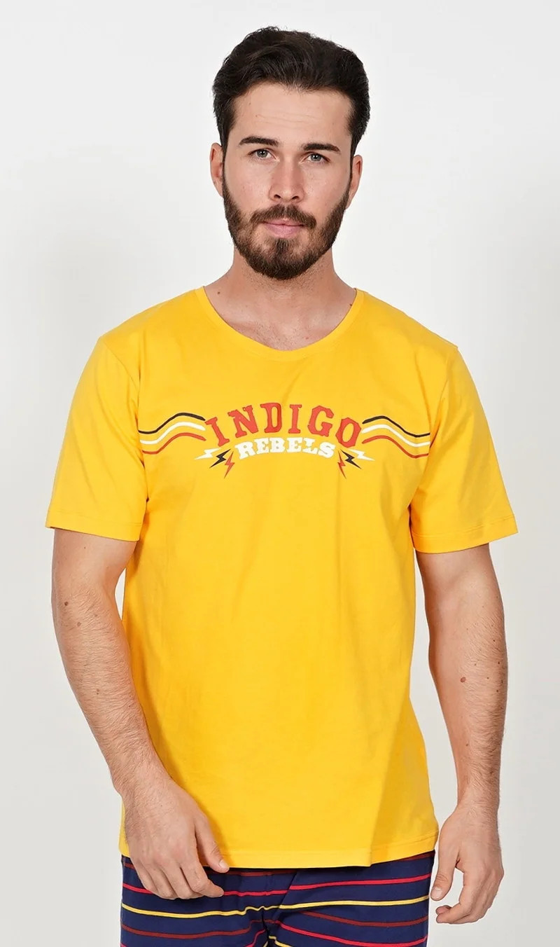 Pánske bavlnené capri pyžamo Indigo. Pánske pyžamo sa skladá z trička s krátkym rukávom a trojštvrťových nohavíc. Jednofarebné tričko je ozdobené nápisom "Indigo Rebels". Tričko dopĺňajú jednofarebné nohavice pod kolená, ktoré majú elastický pás, šnúrku na stiahnutie a praktické vrecká. 100 % bavlnený materiál je príjemný a pružný na dotyk. Pokyny na údržbu: - materiál: 100 % bavlna - možno prať v práčke do 30° - nesušte v sušičke - žehliť na rubovej strane do 110° - nepoužívajte bieliace prostriedky - chemicky nečistiť Veľkosť M L XL obvod hrudníka 104 110 114 dĺžka košele 76 78 80 pás 80-92 82-94 84-96 Zrážanlivosť materiálu je 3% pri prvom praní