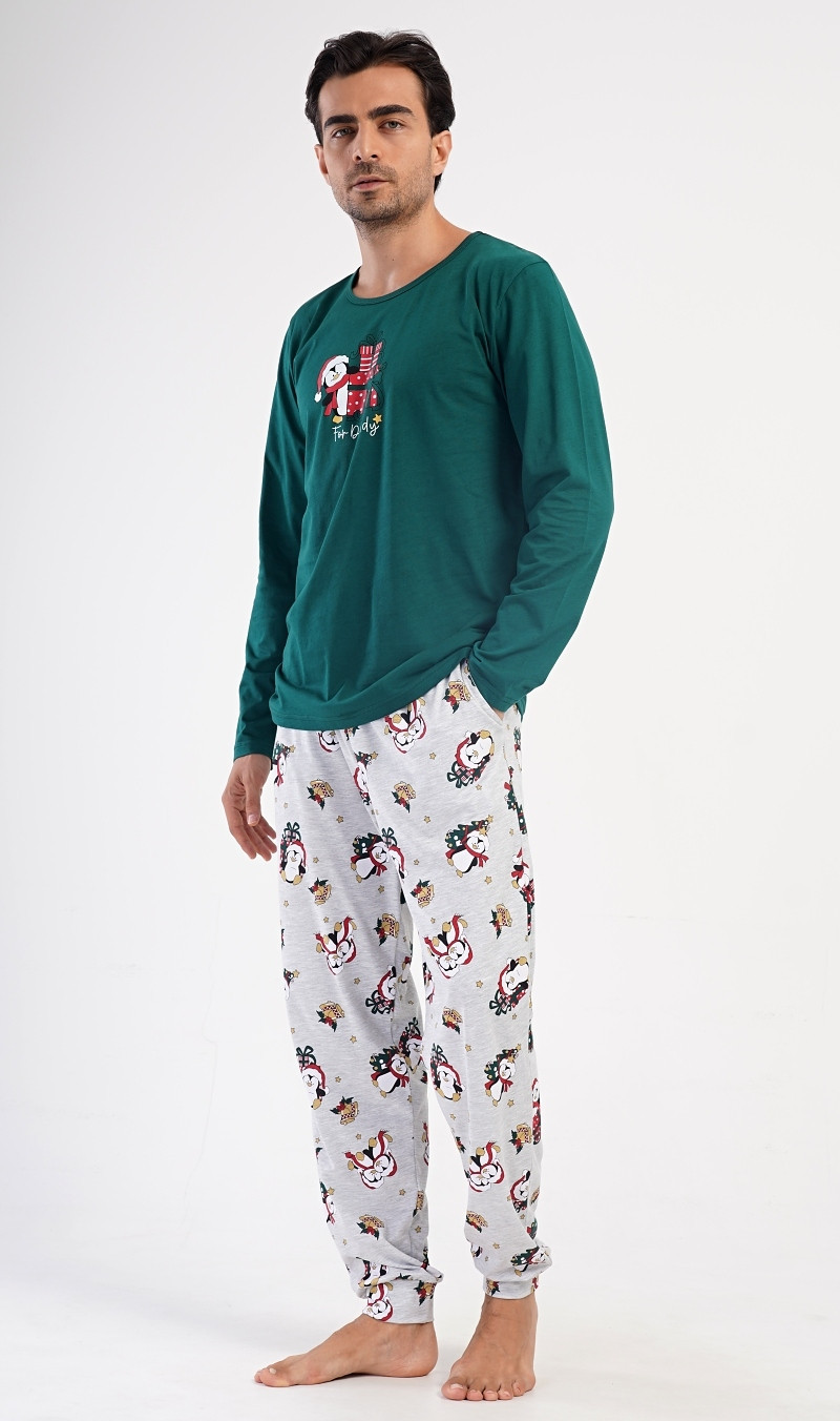Pánské bavlněné pyžamo dlouhé Tučňák s dárkem. Pánské pyžamo se skládá z trika s dlouhým rukávem a dlouhých kalhot. Jednobarevné triko zdobí obrázek tučňáka s dárky. Na kalhotách se tento motiv opakuje také. Kalhoty mají v pase gumu, šňůrku na stažení a praktické kapsy. Použitý materiál je příjemný a poddajný na dotek. Podíl bavlny u trika je 100% a u kalhot 70%. Pokyny pro údržbu: -70% bavlna, 30% polyester - lze prát v pračce při teplotě do 30° - nesušit v sušičce - žehlit z rubu do 110° - nepoužívat bělící prostředky - nečistit chemicky Míry naměřené na výrobku: 4352290879 Tučňák s dárkem M L XL XXL obvod hrudníku 102 104 106 108 délka trika 75 76 77 78 pas 84-96 86-98 88-100 90-102 délka kalhot 105 106 107 108