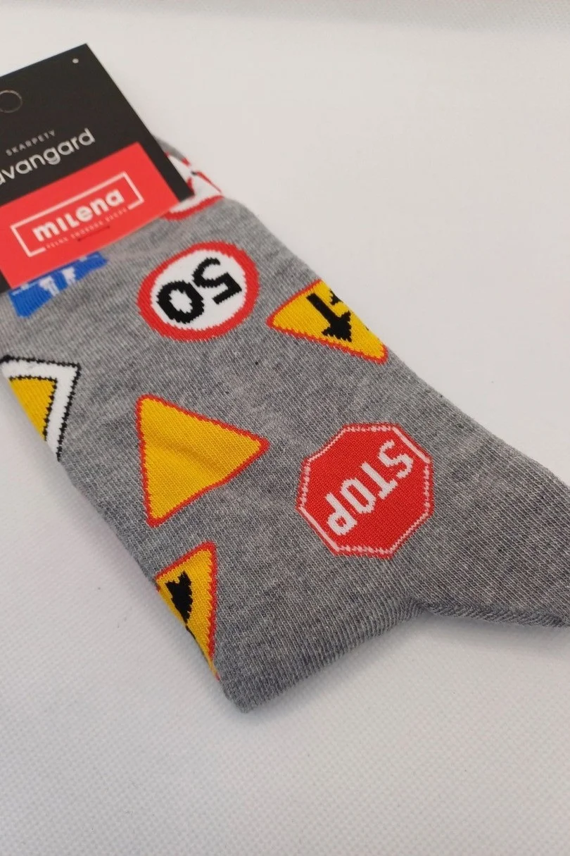 Vneste do svojho každodenného šatníka trochu humoru a originality s pánskymi ponožkami Milena 1153.038 3/4 s motívom dopravných značiek. Tieto vzorované ponožky zaujmú nielen svojím nevšedným dizajnom, ale vďaka vysokému obsahu prírodnej bavlny zabezpečia aj maximálne pohodlie pri nosení. Vďaka svojej 3/4 dĺžke sú praktické k džínsom a oblekovým nohaviciam a vďaka elastickému materiálu sa dokonale prispôsobia každej nohe. Rozhodnite sa pre štýl a pohodlie v originálnom dizajne!.