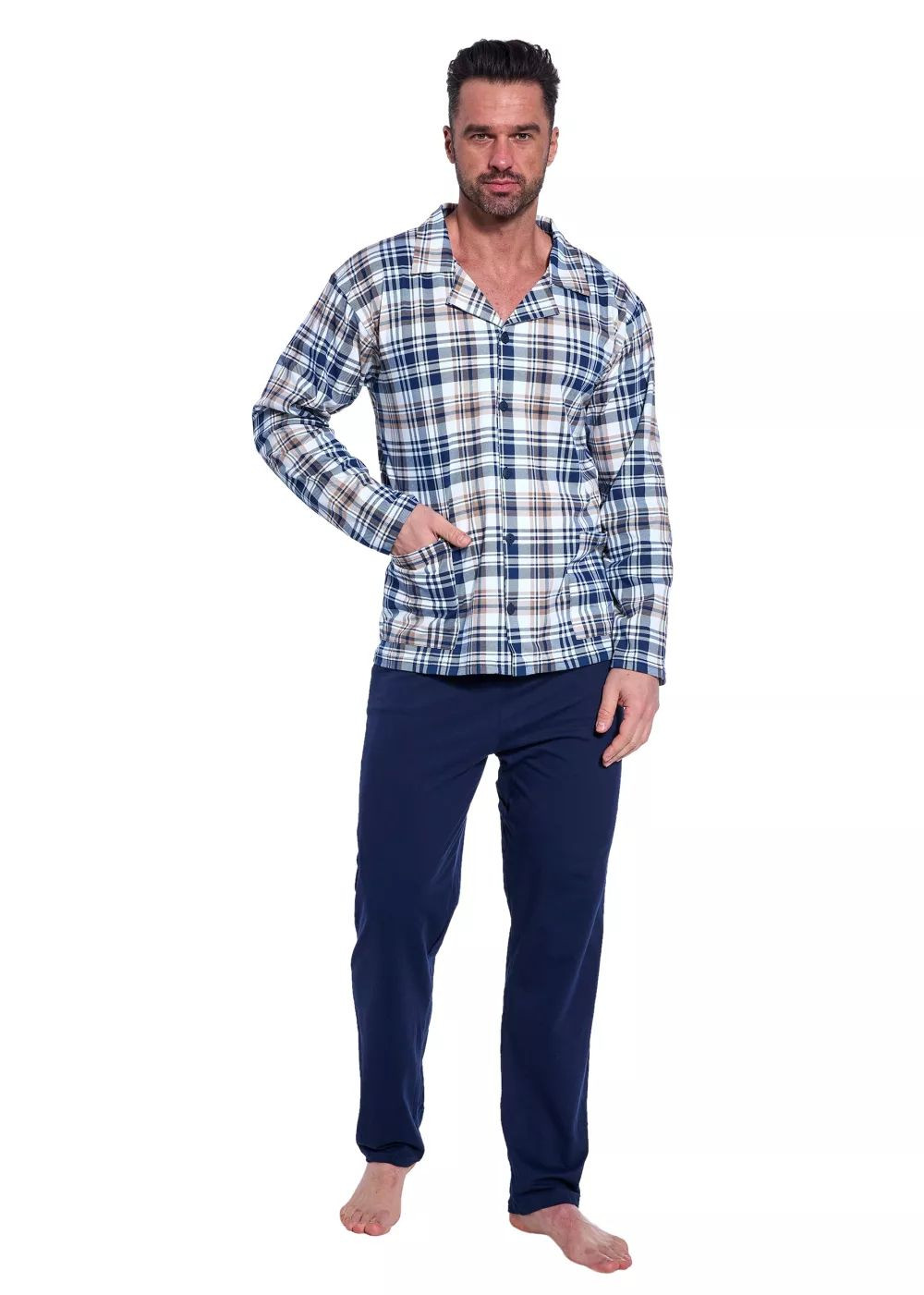 Pánske pyžamo 114/77 CORNETTE - vyrobené z kvalitnej bavlny - kockované tričko s dlhými rukávmi a vreckami - zapínanie na gombíky - pohodlné tmavomodré dlhé nohaviceZloženie materiálu: 100% bavlna Veľkosti pre mužov S M L XL XXL 3XL 4XL 5XL Obvod hrudníka (cm) 92-96 cm 96-100cm 100-104cm 104-108cm 108-112cm 112-116cm 116-122cm 122-128cm Obvod pása (cm) 82-86cm 86-90cm 90-94cm 94-98cm 98-102cm 102-106cm 106-112cm 112-118cm Výška (cm) 164-170cm 170-176cm 176-182cm 182-188cm 188-194cm 188-194cm 188-194cm 188-194cm Veľkosti pre ženy S M L XL XXL 3XL 4XL 5XL Obvod hrudníka (cm) 88-92 cm 92-96cm 96-100cm 100-104cm 104-108cm 108-112cm 112-118cm 118-124cm Obvod pása (cm) 72-76cm 76-80cm 80-84cm 84-88cm 88-92cm 92-96cm 96-102cm 102-108cm Obvod bokov (cm) 92-96cm 96-100cm 100-104cm 104-108cm 108-112cm 112-116cm 116-122cm 122-128cm Výška (cm) 158-164cm 164-170cm 164-170cm 170-176cm 176-182cm 176-182cm 176-182cm 176-182cm Detské veľkosti (roky) 2-3 3-4 5-6 7-8 9-10 11-12 13-14 Obvod hrudníka (cm) 50-54 cm 54-58cm 58-62cm 62-66cm 66-72cm 72-80cm 80-88cm Obvod pása (cm) 48-52cm 50-54cm 52-56cm 54-58cm 56-62cm 60-68cm 64-72cm Výška (cm) 86-92cm 98-104cm 110-116cm 122-128cm 134-140cm 146-152cm 158-164cm