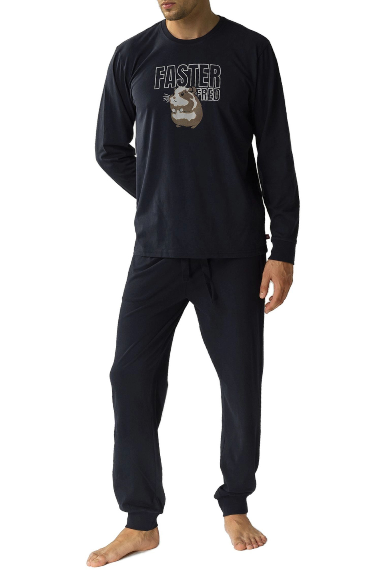 Pánske pyžamo 376 blue Atlantic - vyrobené z kvalitnej bavlny - tmavomodré tričko s dlhými rukávmi - zdobené nápisom na prednej strane - dlhé tmavomodré nohavice s vreckami - nastaviteľný pás na šnúrku - rukávy a nohavice zakončené rebrovanými manžetami Zloženie materiálu: 100% bavlna