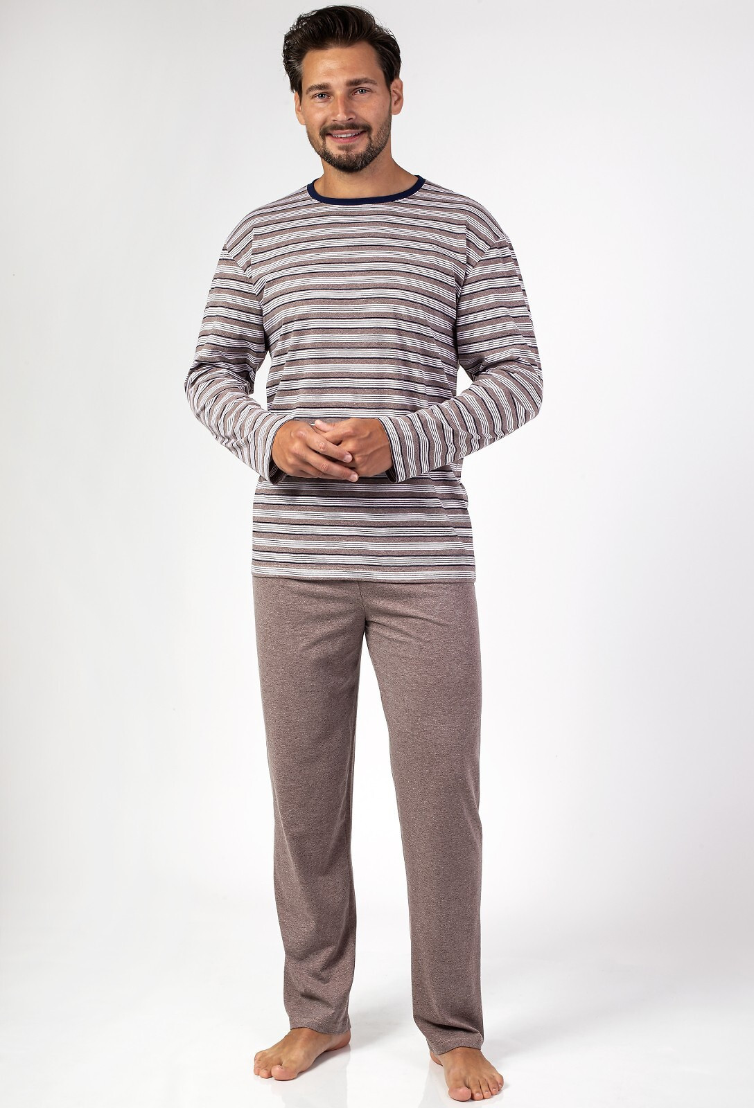 Pánske bavlnené pyžamo - tričko s dlhým rukávom - pruhovaný vzor - polkruhový výstrih - dlhé nohavice Zloženie: 100% bavlna