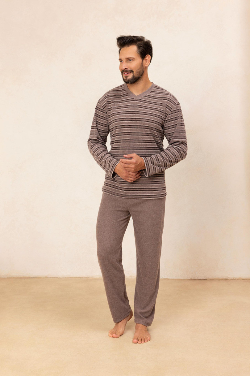 Pánske pyžamo Regina 490 BIG J/25 je klasickou zimnou ponukou vyrobenou výlučne z vysokokvalitnej froté bavlny. Tričko s dlhými rukávmi má posádkový výstrih a módny pruhovaný vzor, ktorý súprave dodáva mierne športový, moderný charakter. Súpravu dopĺňajú dlhé, rovno strihané jednotné nohavice - pohodlné a prispôsobené na každodenné nosenie. Mäkký froté úplet poskytuje teplo a pohodlie, vďaka čomu je táto súprava ideálnou voľbou na chladnejšie večery a zimné noci.