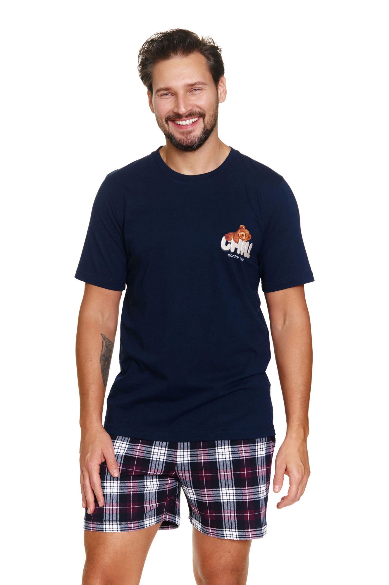 Pánske pyžamo 7201 modré Doctornap - vyrobené z vysokokvalitnej bavlny - tmavomodré tričko s krátkymi rukávmi - zdobené potlačou na prednej strane - kockované šortky s vreckami na bokoch - certifikát OEKO-TEX Standard 100Zloženie materiálu: 100% bavlna