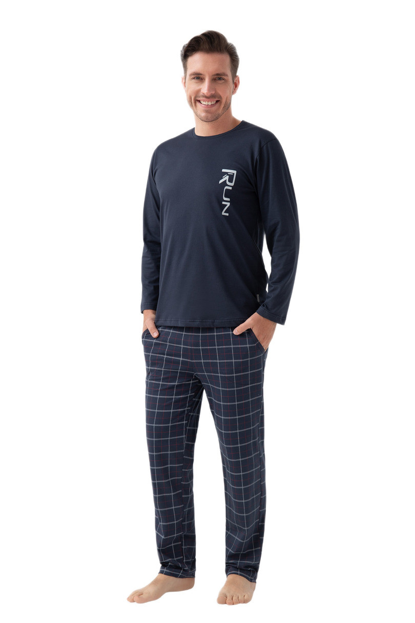 Pánske pyžamo 810 J/25 značky Cornette je klasická súprava, ktorá spája pohodlie a moderný štýl. Košeľa s dlhým rukávom a polkruhovým výstrihom je vyrobená z prírodnej, priedušnej bavlny, vďaka čomu je mäkká a príjemná na nosenie. Na hrudi má ozdobnú potlač s nápisom "RUN", ktorá jej dodáva športový charakter. Nohavice v klasickom károvanom vzore s dlhými nohavicami a praktickými vreckami na bokoch poskytujú voľnosť pohybu a pohodlie na každodenný život. Celok je vyrobený zo 100 % kvalitnej bavlny - ideálny na spanie aj domáci relax.