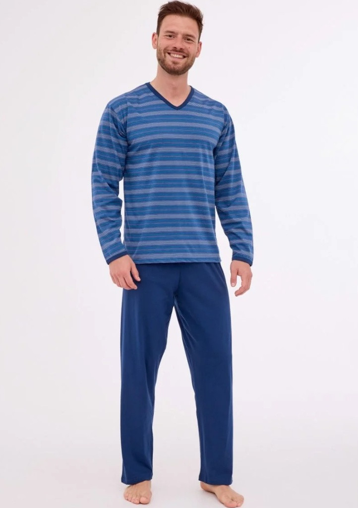 Pohodlné pánske pyžamo s dlhými rukávmi a dlhými nohavicami. Vrchný diel pyžama je vyrobený z mäkkého materiálu s horizontálnymi pruhmi a má výstrih do V, zakončený jemným lemovaním. Súčasťou súpravy sú dlhé hladké nohavice z kvalitnej bavlny v tmavomodrej farbe. Voľný strih pyžama zaručuje maximálne pohodlie a voľnosť pohybu počas spánku. Materiálové zloženie: tričko - 78 % bavlna 22 % polyester, nohavice - 100 % bavlna.