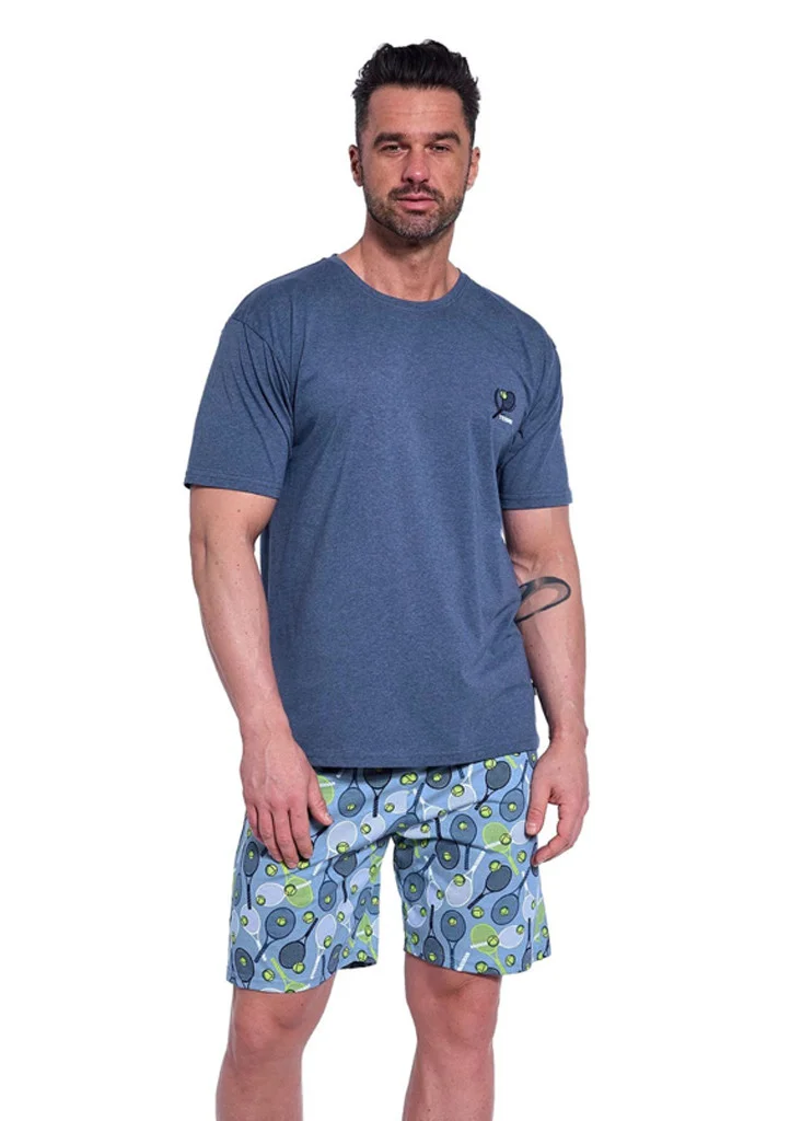 Pánske pyžamo CORNETTE je vyrobené z kvalitnej bavlny a poskytuje maximálne pohodlie počas spánku a odpočinku. Obsahuje džínsovo modré tričko s krátkymi rukávmi, polkruhovým výstrihom a štýlovou potlačou na prednej strane. Pyžamo dopĺňajú pohodlné vzorované šortky, ktoré ladia s celkovým športovo-voľnočasovým vzhľadom. Materiál: 100 % bavlna.