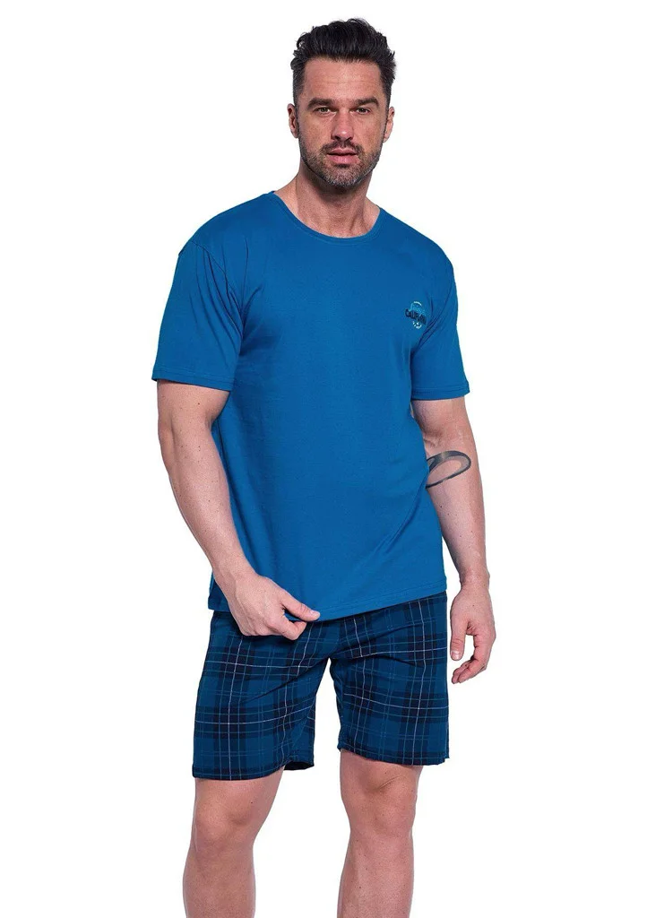 Pánske pyžamo Cornette je vyrobené z kvalitnej bavlny a ponúka pohodlie aj štýl na každodenné nosenie. Pyžamo pozostáva zo svetlomodrého trička s krátkymi rukávmi, polkruhovým výstrihom a štýlovou potlačou na prednej strane. Súčasťou sú aj pohodlné šortky s moderným károvaným vzorom. Ideálna voľba pre mužov, ktorí ocenia kvalitný materiál a premyslený dizajn. Materiál: 100 % bavlna.