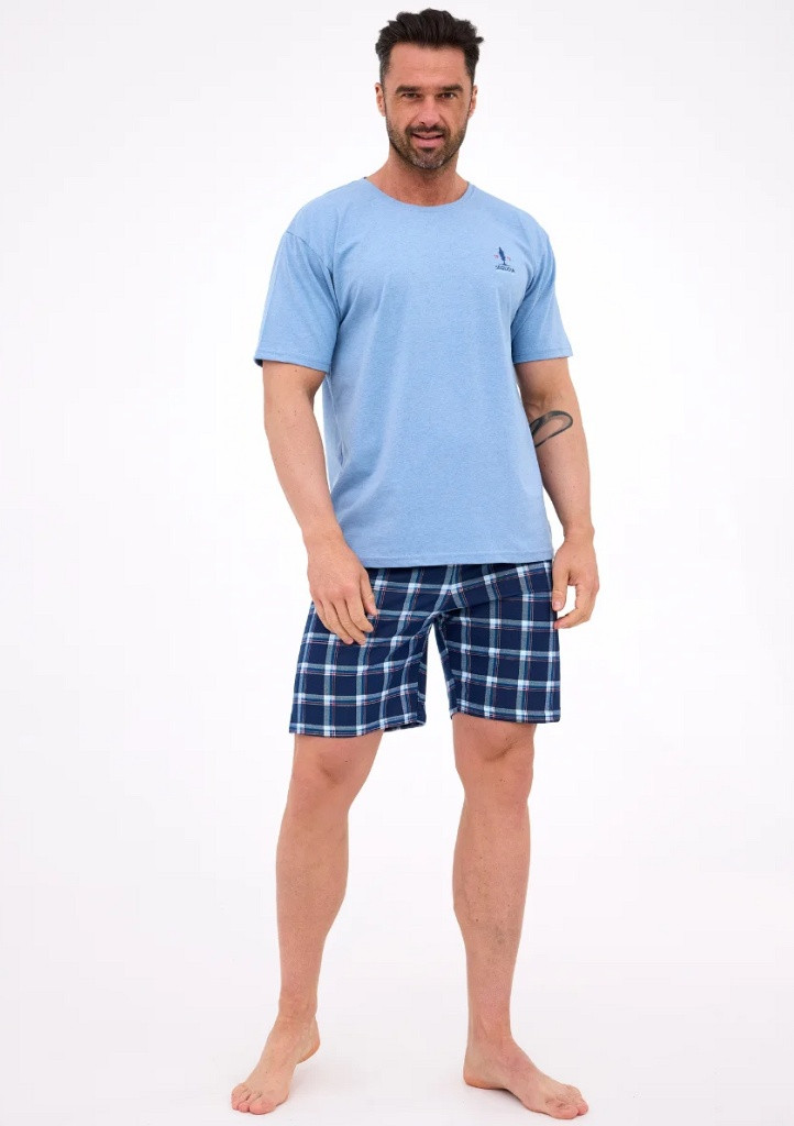 Moderné pánske pyžamo značky Cornette pozostáva z trička s krátkym rukávom a šortiek. Tričko má okrúhly výstrih a jemnú potlač na hrudi. Šortky majú károvaný vzor a elastický pás s bavlnenou podšívkou. Materiálové zloženie: tričko 80 % bavlna, 20 % polyester; šortky 100 % bavlna