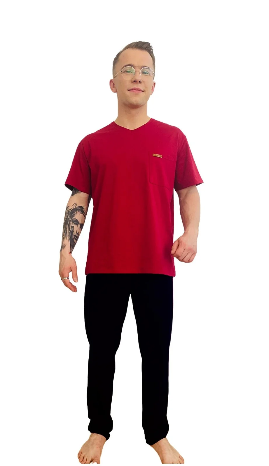 Panské pyžamo. Pyžamová blúzka má krátke rukávy, výstrih do V a je zdobená vreckom. Komplet dopĺňajú dlhé jednofarebné nohavice. Zloženie: 95% bavlna, 5% elastan.