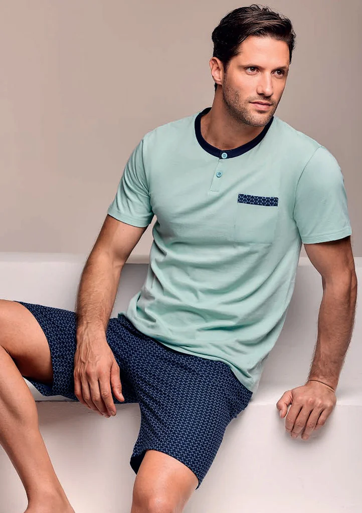 Štýlové pánske pyžamo Infiore zaujme elegantnou kombináciou svetlej mentolovej a tmavomodrej farby. Tričko s krátkym rukávom má kontrastný výstrih, zapínanie na gombíky a ozdobné vrecko s jemným vzorom, ktoré ladí s šortkami. Tie sú vyrobené z ľahkého materiálu a zdobí ich drobná geometrická potlač. Pyžamo je ideálne na pohodlný spánok aj na doma - vďaka kvalitnej bavlne sa príjemne nosí a dobre drží tvar. Materiál: 100 % bavlna.