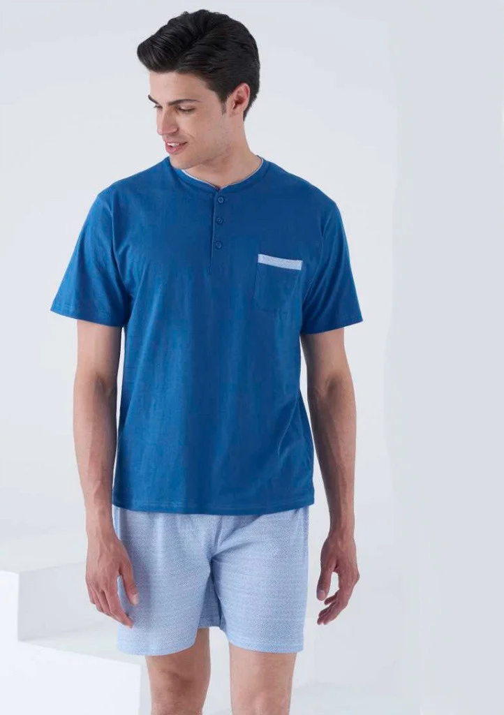 Pánske bavlnené pyžamo od talianskej značky Karelpiu. 100% bavlna, veľmi príjemné a pohodlné aj v letných mesiacoch. Tričko má krátke rukávy, okrúhly výstrih a zapínanie na tri gombíky. Na ľavej prednej strane je našité vrecko. Voľné šortky majú pohodlný elastický pás. Zloženie materiálu: 100% bavlna.