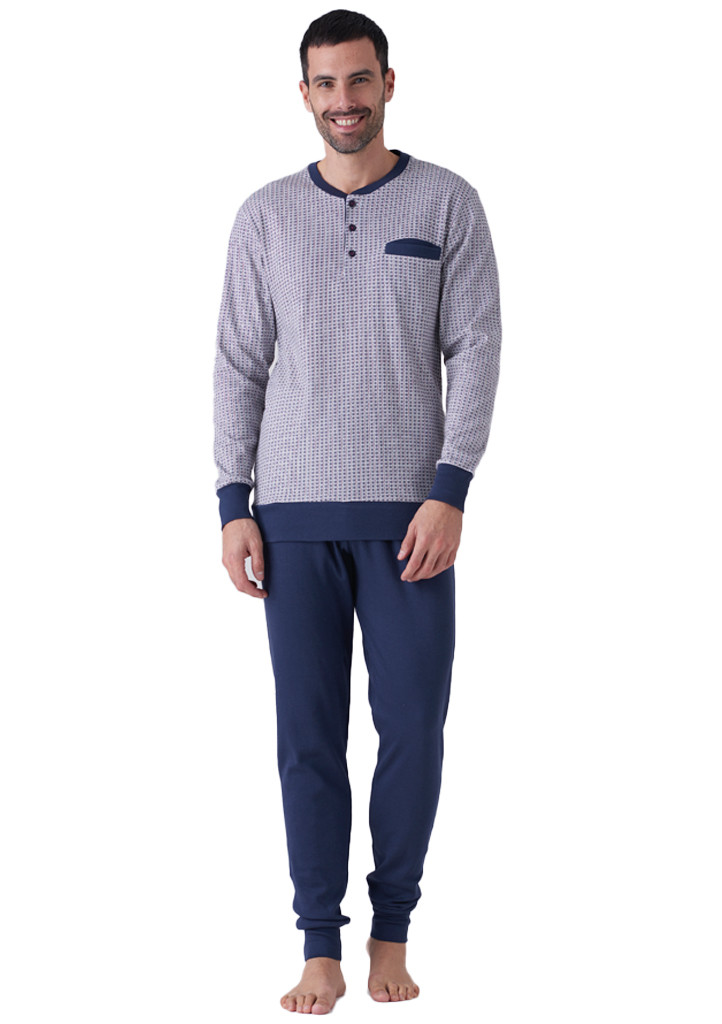 Pánske bavlnené pyžamo talianskej značky Karelpiu. Pyžamo je vyrobené zo 100 % bavlny, je veľmi pohodlné a príjemné. Košeľa má dlhé rukávy, okrúhly výstrih a zapínanie na tri gombíky. Na ľavej prednej strane je všité vrecko. Voľné nohavice majú pohodlný elastický pás, nohavice sú zakončené širokou légiou. Materiálové zloženie: 100 % bavlna.