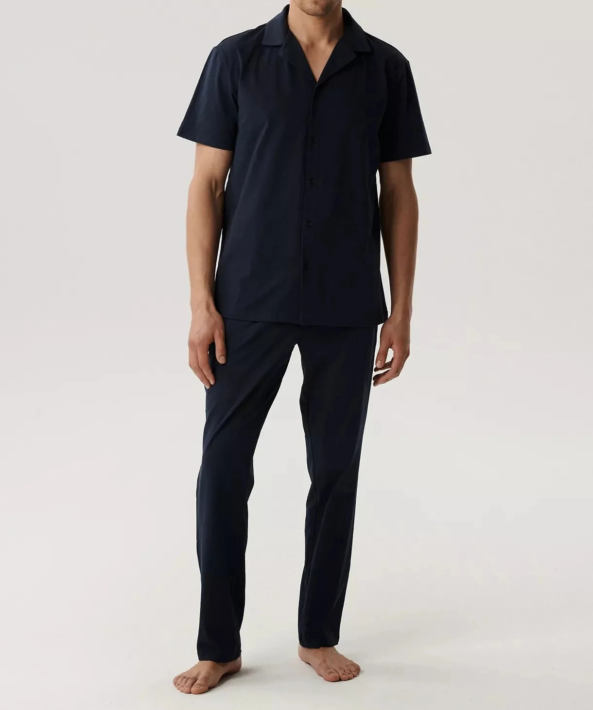 Klasické pánske pyžamo - mäkký bavlnený úplet - blúzka s golierom, krátke rukávy, zapínanie na gombíky - dlhé rovné nohavice - široký, hladký, bavlnený elastický pás, bez opasku - pohodlné vrecká na bokoch Zloženie: 95 % bavlna, 5 % elastan
