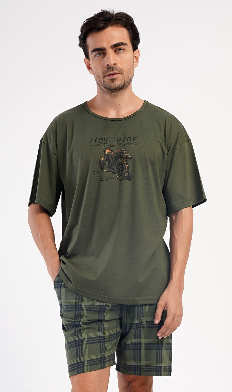 Pánské bavlněné šortkové pyžamo David. Pánské pyžamo se skládá z trička s krátkým rukávem a krátkých šortkových kalhot. Na tričku je obrázek terénního motocyklu a nápis 'Long ride'. Tričko doplňují kárované šortky, které mají v pase gumu, šňůrku na stažení a praktické kapsy. Použitý materiál s obsahem bavlny 100% je příjemný a poddajný na dotek. Pokyny pro údržbu: - 100% bavlna - lze prát v pračce při teplotě do 30° - nesušit v sušičce - žehlit z rubu do 110° - nepoužívat bělící prostředky - nečistit chemicky Míry naměřené na výrobku: Míry naměřené na výrobku: 4032382053 David M L XL XXL obvod hrudníku 112 116 120 124 délka trika 73 74 75 76 pas 74-86 76-88 78-90 80- 92