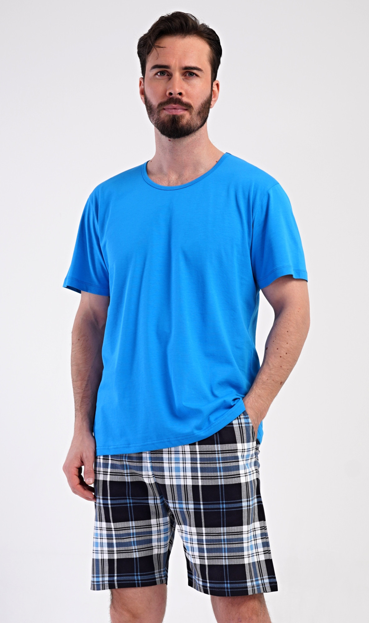 Pánské bavlněné šortkové pyžamo Henry. Pánské pyžamo se skládá z trička s krátkým rukávem a krátkých šortkových kalhot. Jednobarevné tričko má kulatý výstřih a je vhodné pro všechny milovníky pohodlné módy bez potisku. Tričko doplňují kárované šortky, které mají v pase gumu, šňůrku na stažení a praktické kapsy. Použitý materiál s obsahem bavlny 100% je příjemný a poddajný na dotek.