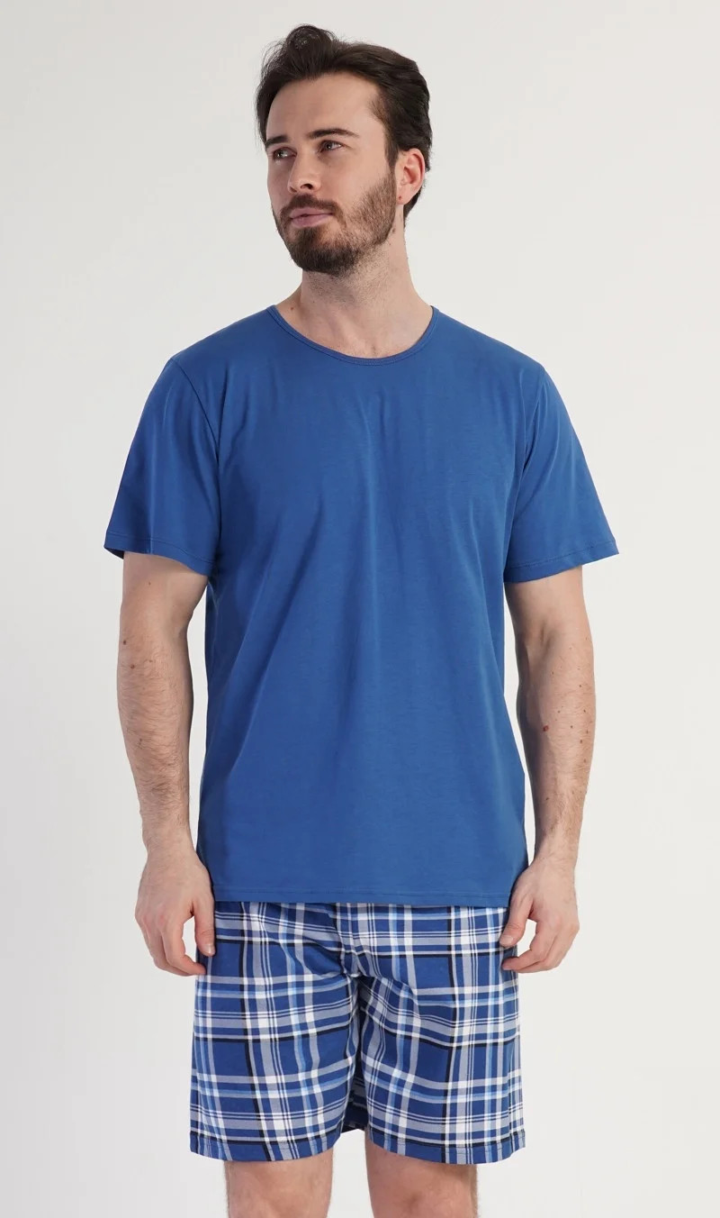 Pánske bavlnené šortky Motocyklové pyžamo - pánske pyžamo pozostávajúce z trička s krátkym rukávom a krátkych šortiek - tričko má na zadnej strane obrázok motocykla a nápis "Motor life - tričko je doplnené károvanými šortkami, ktoré majú elastický pás a šnúrku na stiahnutie, ale nemajú vrecká Zloženie materiálu: 100 % bavlna Pokyny na údržbu: Materiál: bavlna, tričko, košeľa: - možno prať v práčke do 30° - nesušte v sušičke - žehliť na rubovej strane do 110° - nepoužívajte bieliace prostriedky - nečistiť chemicky M L XL XXL obvod hrudníka 104 108 112 116 dĺžka košele 72 74 78 79 pás 78-90 80-92 82-94 90-102 dĺžka šortiek 47 50 51 52
