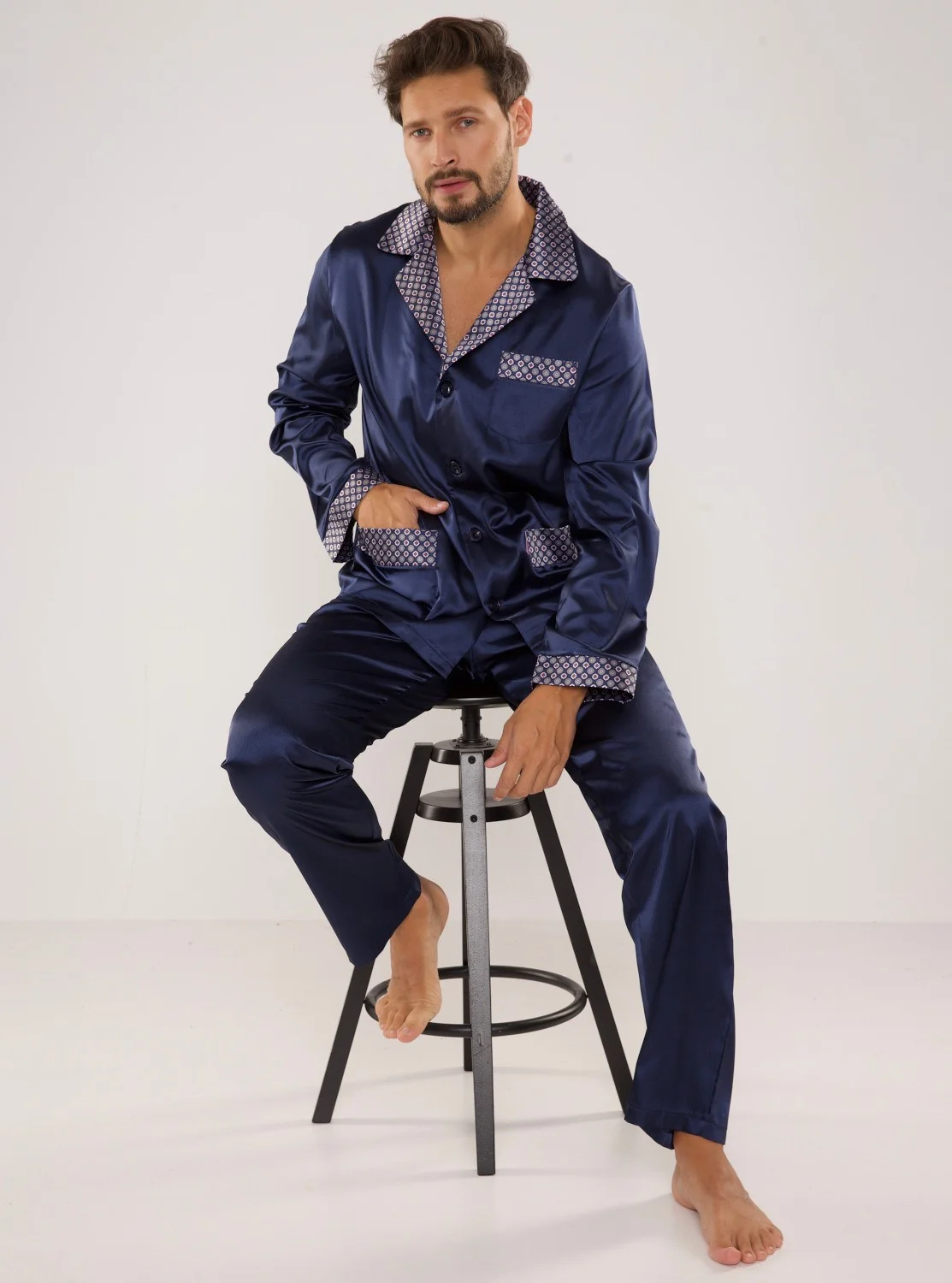 Pánske saténové pyžamo.Blúza pyžamá má golier, vrecká a rozopína sa. Dlhé jednofarebné nohavice majú na bokoch dve vrecká. Manžety, golier a vrecká sú ozdobené vzorovaným materiálom. Zloženie: 97% polyester, 3% elastan.