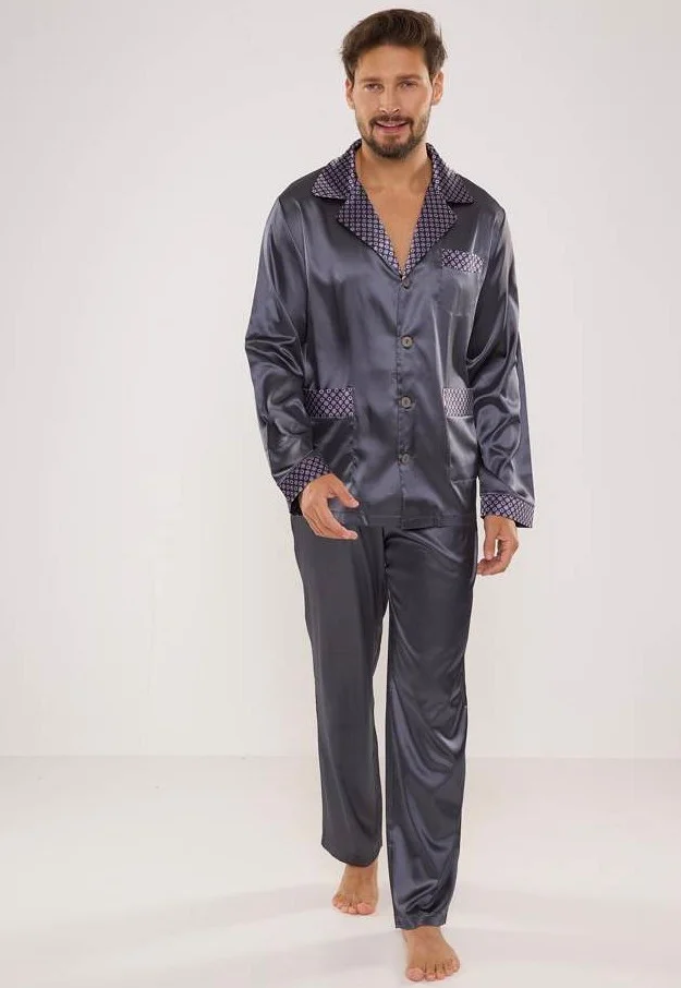 Pánske saténové pyžamo.Blúza pyžamá má golier, vrecká a rozopína sa. Dlhé jednofarebné nohavice majú na bokoch dve vrecká. Manžety, golier a vrecká sú ozdobené vzorovaným materiálom. Zloženie: 97% polyester, 3% elastan.