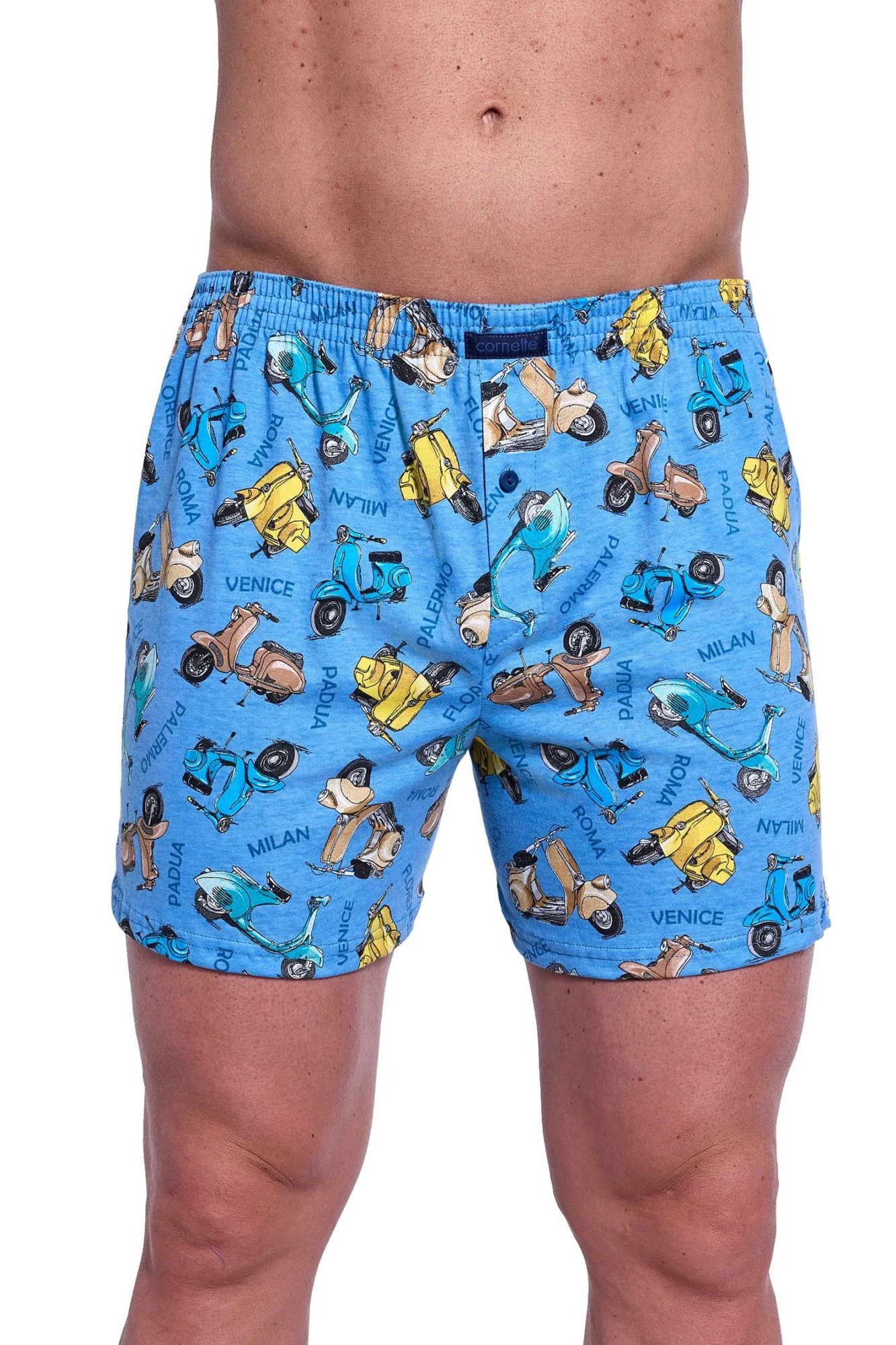 Pánske šortky 011/172 Classic plus CORNETTE - svetlomodré - vyrobené z kvalitnej bavlny - so vzorom - voľný strih modelu je zárukou pohodlia, ktoré potrebuje a ocení každý muž - pohodlný elastický pás je podšitý bavlnou - rozparok sa zapína na gombík Zloženie materiálu: 100% bavlna Veľkosti pre mužov S M L XL XXL 3XL 4XL 5XL Obvod hrudníka (cm) 92-96 cm 96-100cm 100-104cm 104-108cm 108-112cm 112-116cm 116-122cm 122-128cm Obvod pása (cm) 82-86cm 86-90cm 90-94cm 94-98cm 98-102cm 102-106cm 106-112cm 112-118cm Výška (cm) 164-170cm 170-176cm 176-182cm 182-188cm 188-194cm 188-194cm 188-194cm 188-194cm Veľkosti pre ženy S M L XL XXL 3XL 4XL 5XL Obvod hrudníka (cm) 88-92 cm 92-96cm 96-100cm 100-104cm 104-108cm 108-112cm 112-118cm 118-124cm Obvod pása (cm) 72-76cm 76-80cm 80-84cm 84-88cm 88-92cm 92-96cm 96-102cm 102-108cm Obvod bokov (cm) 92-96cm 96-100cm 100-104cm 104-108cm 108-112cm 112-116cm 116-122cm 122-128cm Výška (cm) 158-164cm 164-170cm 164-170cm 170-176cm 176-182cm 176-182cm 176-182cm 176-182cm Detské veľkosti (roky) 2-3 3-4 5-6 7-8 9-10 11-12 13-14 Obvod hrudníka (cm) 50-54 cm 54-58cm 58-62cm 62-66cm 66-72cm 72-80cm 80-88cm Obvod pása (cm) 48-52cm 50-54cm 52-56cm 54-58cm 56-62cm 60-68cm 64-72cm Výška (cm) 86-92cm 98-104cm 110-116cm 122-128cm 134-140cm 146-152cm 158-164cm