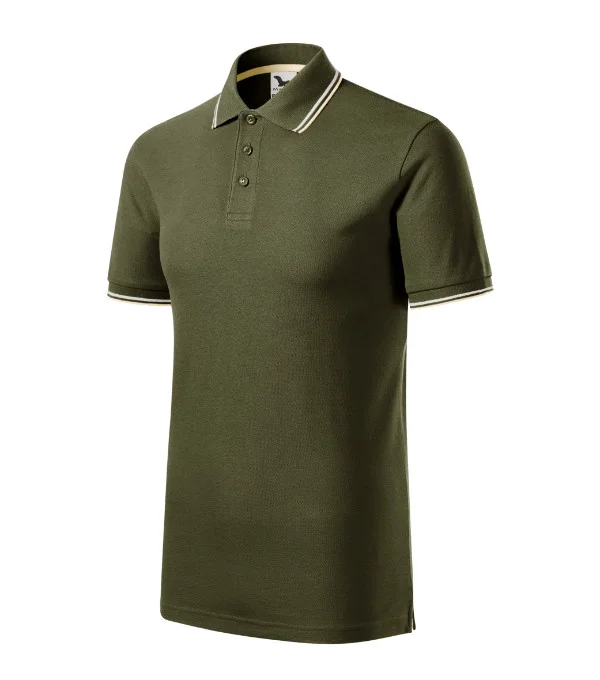 strih s bočnými švami 1:1 rebrovaný golier 2 kontrastné pruhy na rukávoch a manžete goliera s 3 gombíkmi vo farbe materiálu spodný gombík prišitý kontrastnou niťou vnútorný výstrih utesnený kontrastnou páskou ramenné švy spevnené páskou rozparky v bočných švoch s kontrastnou páskou