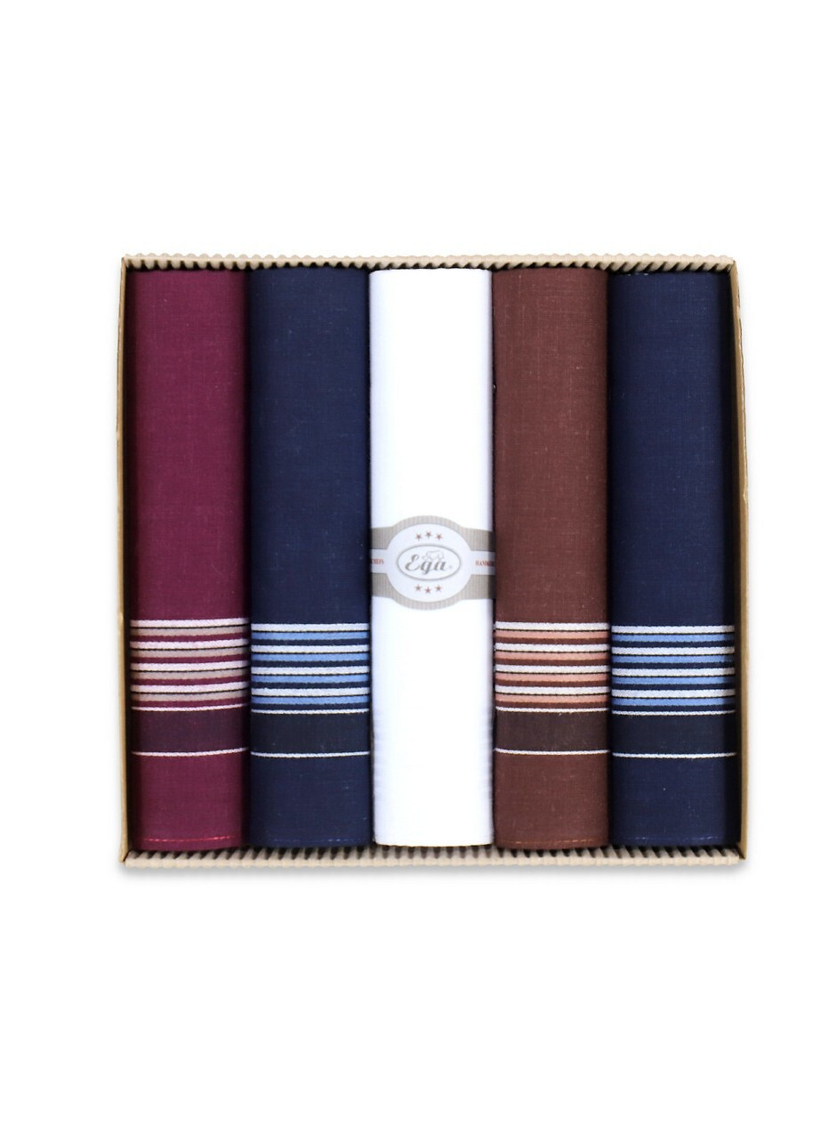 Pánske vreckovky - vyrobené z hladkej, jemne tkanej bavlny - podšité úzkym plochým švom - balené po päť kusov v ekologickej škatuli - veľkosť 40x40 cm - náhodne vybrané dostupné farby: bielo-sivá, modro-šedá, modro-šedá Zloženie: 100 % bavlna