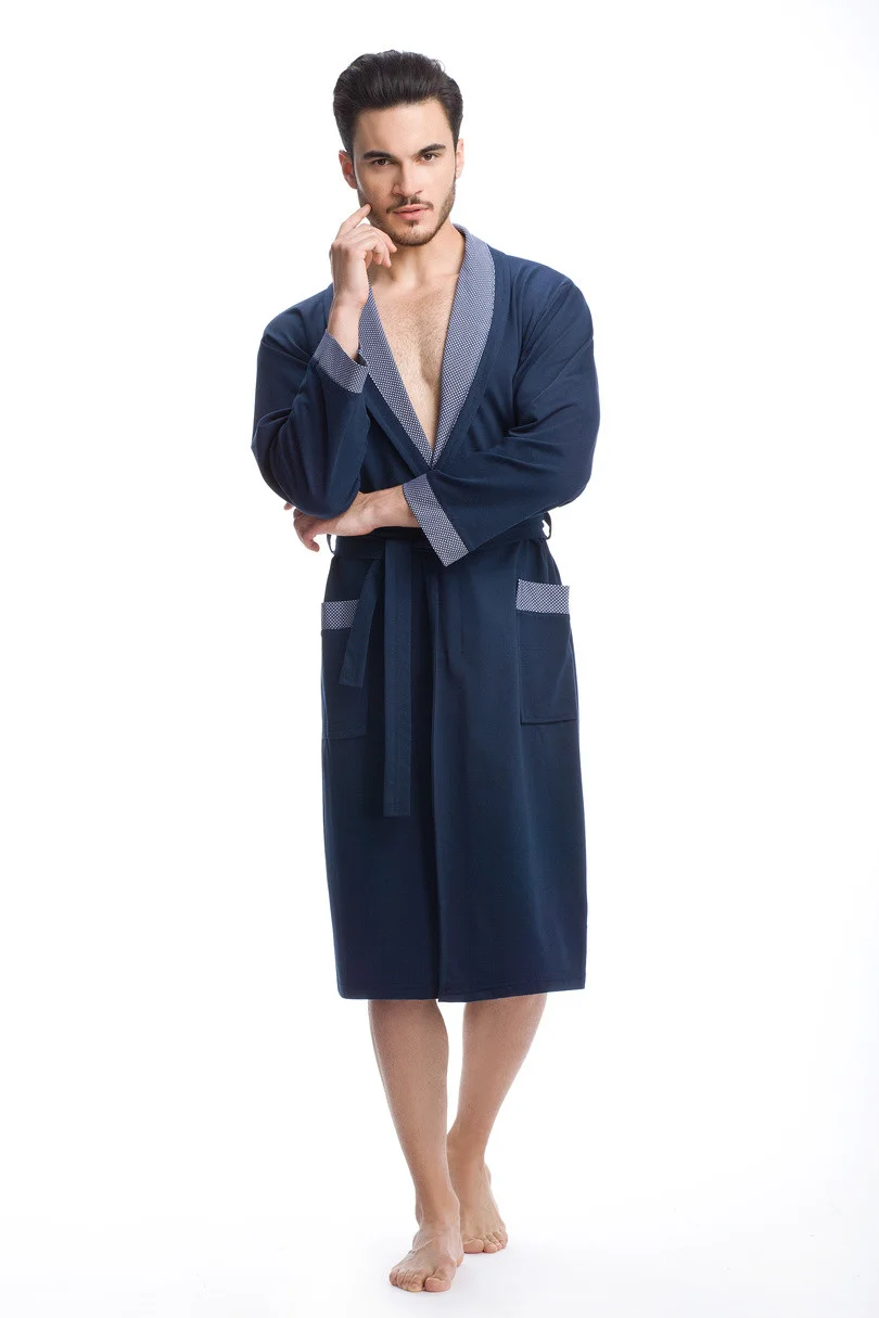 Pohodlný pánsky župan so zaväzovaním v páse, golierom a vreckami ukončenými kontrastnou látkou.100% bavlna.