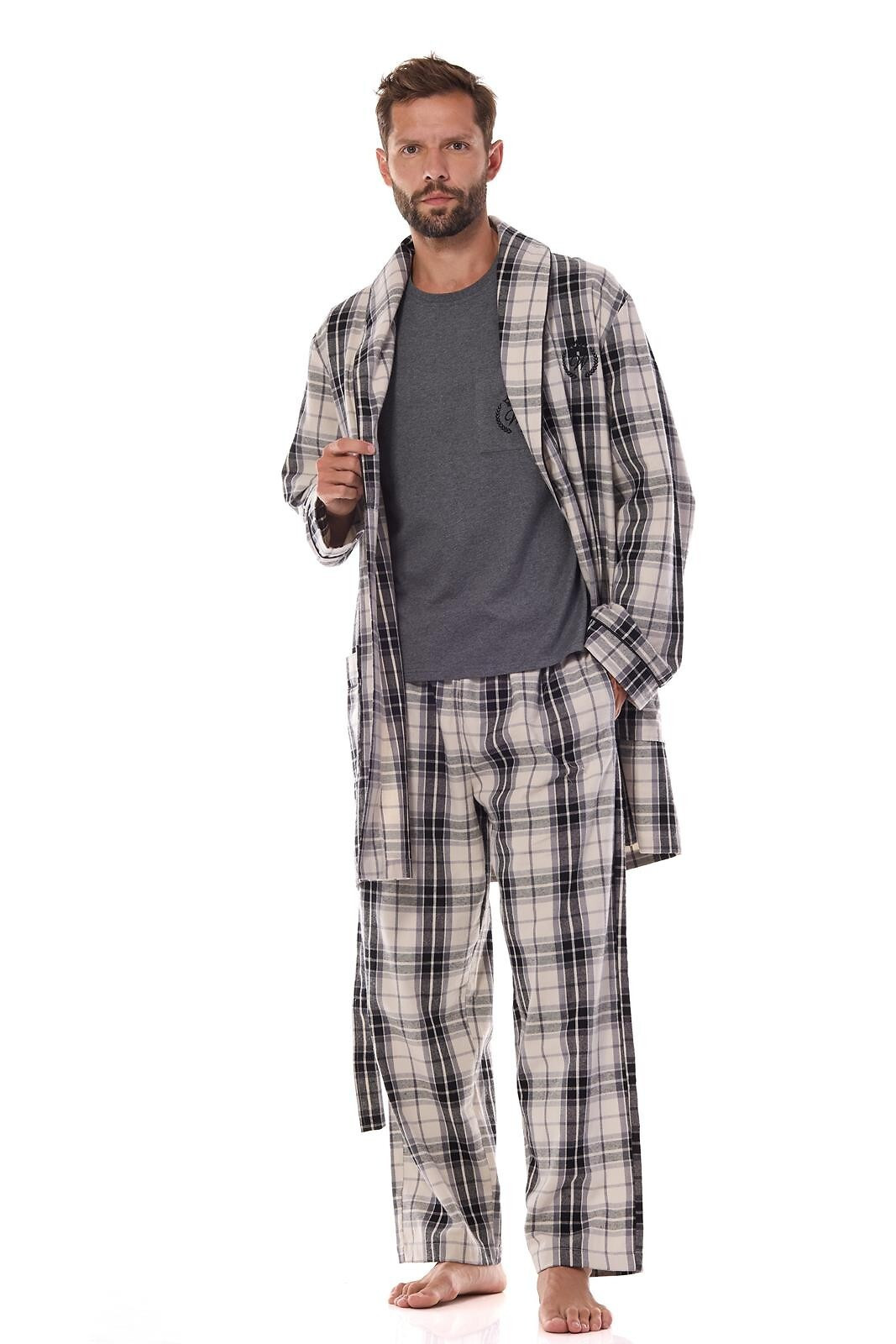 Krátky pánsky župan - klasický strih - teplý károvaný flanel - šálový golier - ozdobná výšivka na hrudi - vrecká so záplatami na bokoch - zaväzovanie v páse - dĺžka pred kolená 100 % bavlna