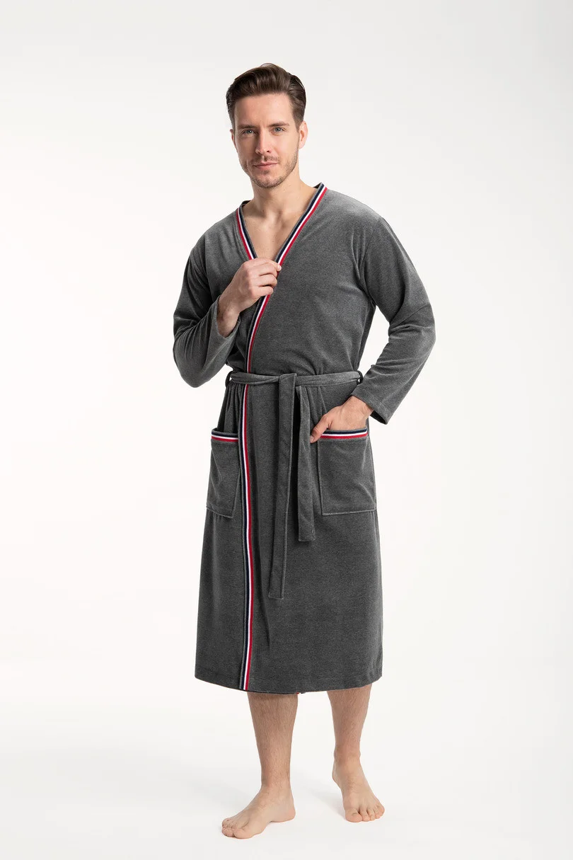 Pánsky župan Luna s dlhými rukávmi, farebnými záhybmi, zapínaním na opasok, vreckami a dĺžkou do polovice lýtok.Zloženie: velúr: 80% bavlna, 20% polyester