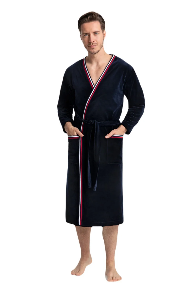 Pánsky župan Luna s dlhými rukávmi, farebnými záhybmi, zapínaním na opasok, vreckami a dĺžkou do polovice lýtok.Zloženie: velúr: 80% bavlna, 20% polyester