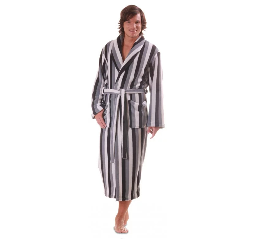 Pánsky teplý župan - sivé pruhy. Úspešná kolekcia pánskych hrejivých županov z koralového flísového materiálu. Svieže, jasné odtiene kráľovskej modrej a tlmené tóny dymovej sivej ponúkajú výber pre pokojné aj akčné povahy. Klasická dĺžka a pohodlný strih so šálovým golierom a dvoma vreckami.