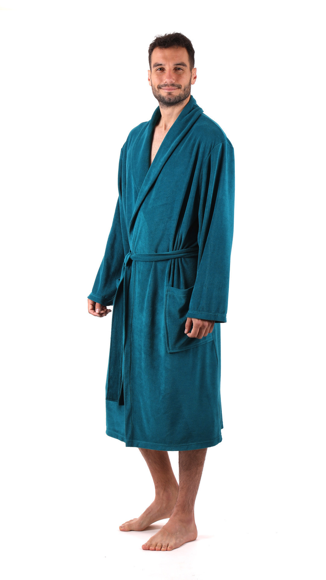 Ľahký pánsky bavlnený froté župan pre nerušené chvíle odpočinku. Materiál: ľahký froté úplet z 80 % bavlny, 20 % polyesteru Strih: klasický strih so šálovým golierom v dĺžke 115 cm Použitie: ako ľahký župan nielen na cestovanie, ale aj na osušenie K dispozícii vo veľkostiach 3-6XL Potrebujete inú ako štandardnú veľkosť? Pánsky župan Bari vyniká ľahkosťou a nadčasovým strihom. Je vyrobený z mäkkého, tenkého bavlneného froté, ktoré je príjemné na pokožku a spoľahlivo absorbuje vlhkosť. Vďaka tomu je vhodný nielen po kúpeli, ale aj na letné dni, keď oceníte jeho vzdušnosť. Župan má klasický šálový golier, dve priestranné vrecká a opasok v páse. Jeho elegantný dizajn spája praktickosť a pohodlie, takže sa stane vaším spoľahlivým spoločníkom doma, pri bazéne alebo na dovolenke. Jeho ľahký, mäkký a savý materiál s vysokým obsahom bavlny je ideálny pre väčšie postavy. Nebude vám v ňom zbytočne teplo, nepridáva na objeme vďaka materiálu s nízkym žmolkovaním, je pružný a prispôsobí sa vašim potrebám.Pánske Bari: Bari petrolStrih: šálový golierMateriál: 80 % bavlna 20 % polyester froté úpletÚčel použitia: voľný čas/ľahká Vhodné navyšívanie: vhodné na všetky typy výšiviek