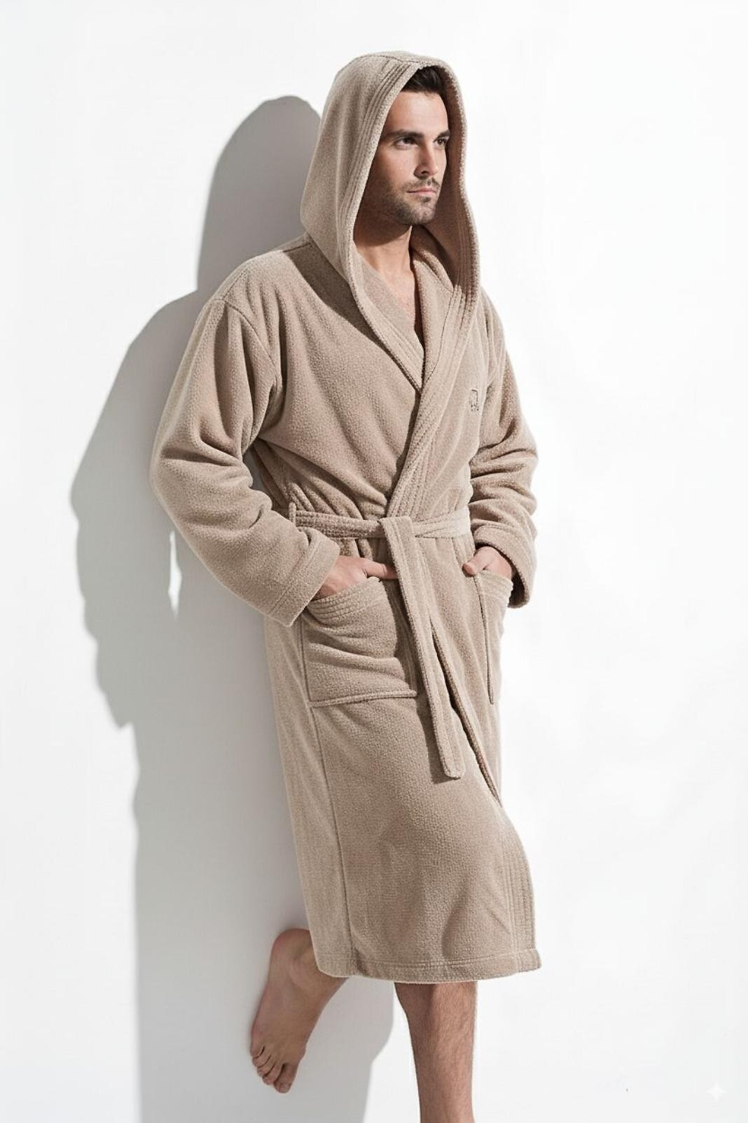 Pánsky župan s kapucňou. Župan je vyrobený z mäkkej látky (soft), na bokoch má vonkajšie vrecká a zaväzuje sa v páse. Na úrovni hrudníka je našitá aplikácia. Župan je mäkký a príjemný na dotyk a pri nosení je veľmi pohodlný a komfortný.