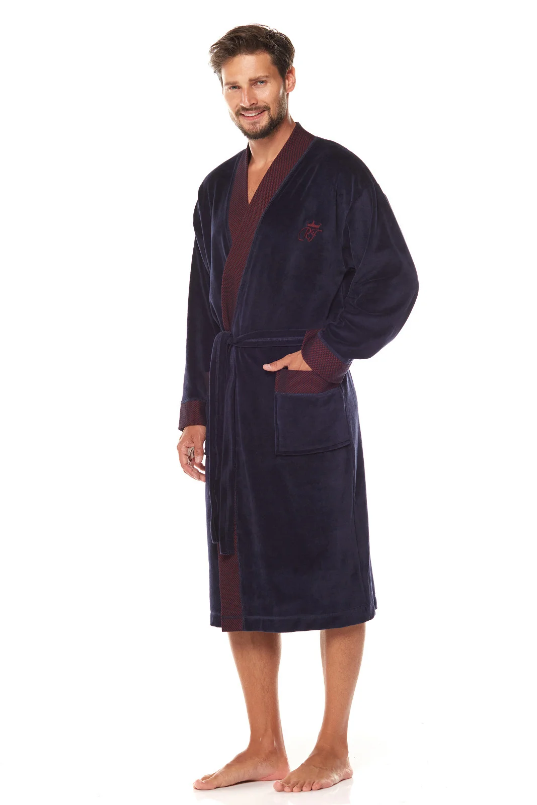 Pánsky velúrový župan- dlhé, so šálovým golierom, zaväzované v páse- dve vrecká na úrovni bokov- manžety, golier a vrecká zo vzorovaného úpletu- malá aplikácia na úrovni hrudníkaZloženie: 80% bavlna, 20% polyester