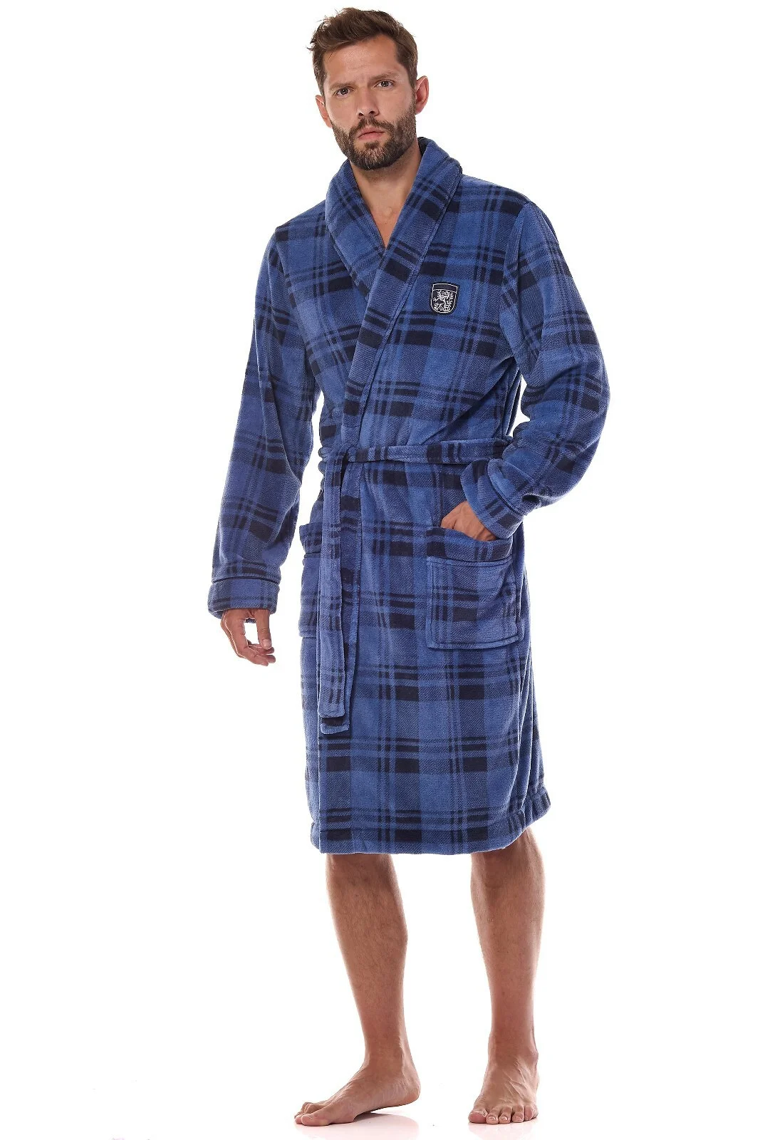 Pánsky župan - príjemná a mäkká pletená károvaná tkanina - šálový golier - malá aplikácia na hrudi - zaväzovanie v páse - manžety a golier lemované hladkým lemovaním - pohodlné vrecká na bokoch Zloženie: 100 % polyester