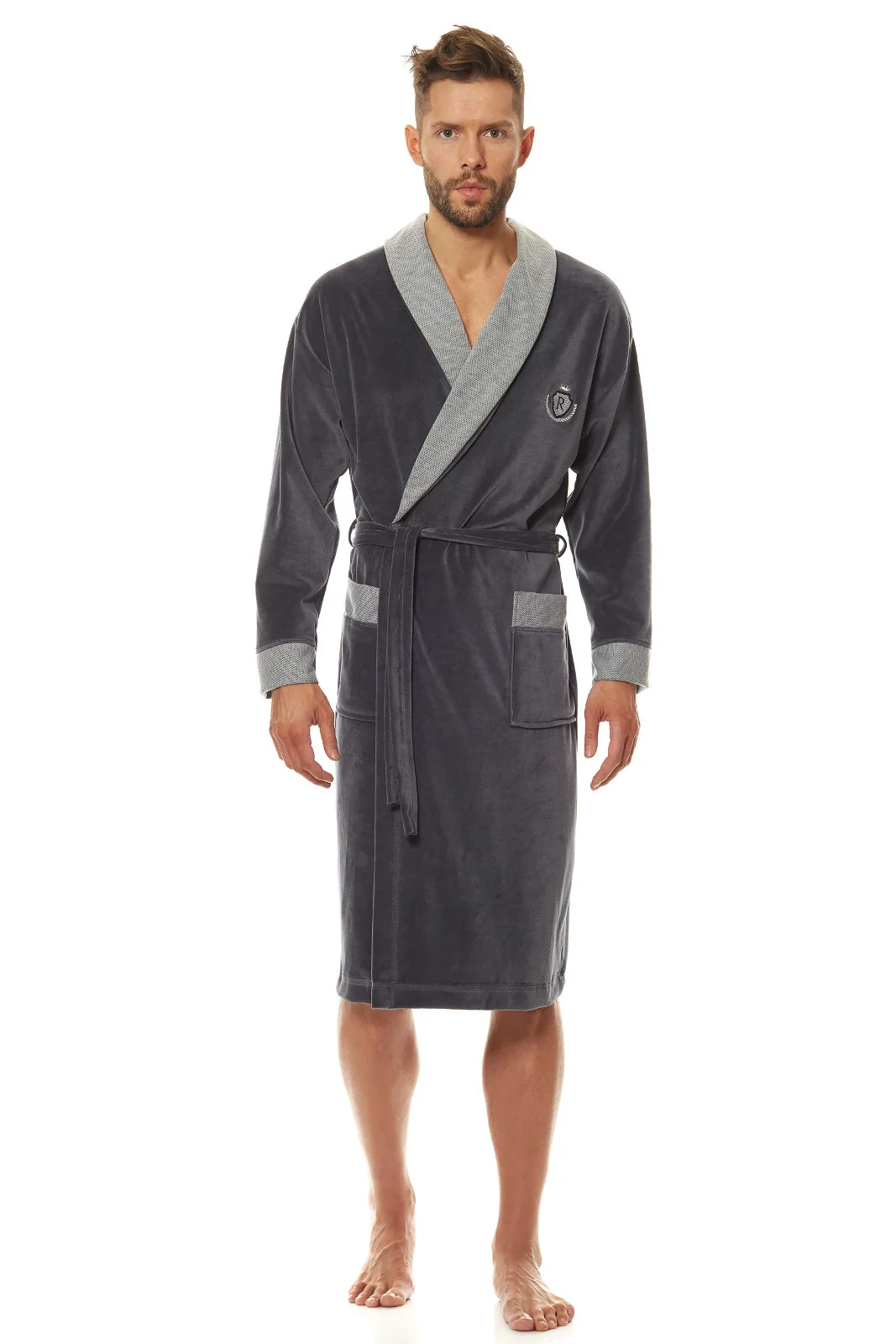 Pánsky velúrový župan so šálovým golierom. Župan je dlhý av páse sa zaväzuje. Na úrovni bokov sú dve vrecká. Manžety, golier a vrecká zdobí vzorovaná látka. Na hrudníku je ozdobná aplikácia. Zloženie: 80% bavlna, 20% polyester.