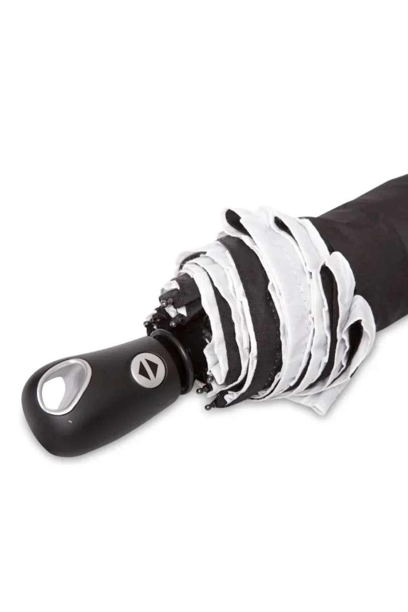 Dámsky "parížsky" dáždnik s volánom. Skladací v 3, automaticky sa otvára a zatvára. Rám: ľahká, veľmi pevná strieška z hliníka, sklenených vlákien a KARBÓNOVEJ OCELI, oceľová teleskopická rúrka v čiernej farbe, plastová rukoväť, vysokokvalitný polyesterový poťah Pongee ukončený volánom .