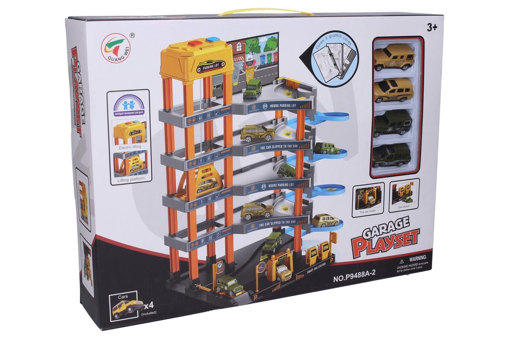 Parkovacie stanice. Rozmery 36,5 x 21,5 x 46,5 cm. Zahŕňa 4 autá (voľné kolesá), umývačku áut, čerpaciu stanicu, servis a elektrický výťah. Batérie 3xAAA nie sú súčasťou balenia. Vybudujte si vlastnú parkovaciu stanicu s garážou. Rozmery 36,5 x 21,5 x 46,5 cm. Zahŕňa 4 autá (voľné kolesá), umývačku áut, čerpaciu stanicu, servis a elektrický výťah. Batérie 3xAAA nie sú súčasťou balenia. Odporúčaný vek: 3+