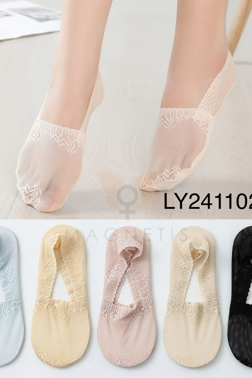 Ponožky Magnetis LY241102 sú elegantné a mimoriadne mäkké ponožky z jemnej sieťoviny s čipkovým lemom. Ich vzdušná štruktúra zaručuje pohodlie pri celodennom nosení a elastický materiál sa dokonale prispôsobí chodidlu. Sú dostupné v širokej škále pastelových a klasických farieb a sú vhodné do balerínok, mokasín a elegantných topánok..