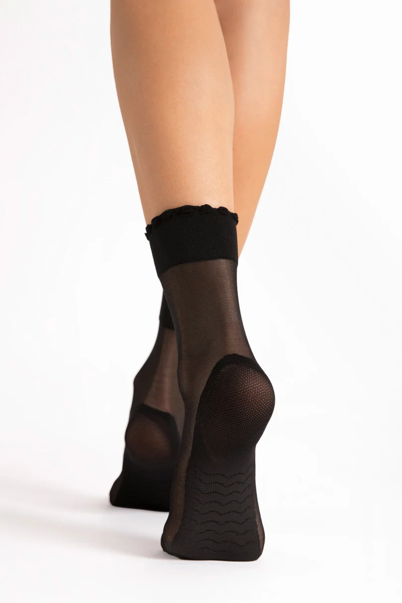 Ponožky Pico Massage 20 denier od spoločnosti Fiore sú elegantným a funkčným doplnkom, ktorý spája štýl s pohodlím.Priehľadný materiál zdôrazňuje mäkkosť a ľahkosť, zatiaľ čo jemný volánik na leme dodáva šarm.Inovatívna podrážka s masážnym efektom podporuje pohodlie pri nosení a poskytuje chodidlu jemnú stimuláciu pri každom kroku.Zosilnená päta a špička zvyšujú odolnosť výrobku, takže je ideálnou voľbou na každodenné nosenie a špeciálne príležitosti..
