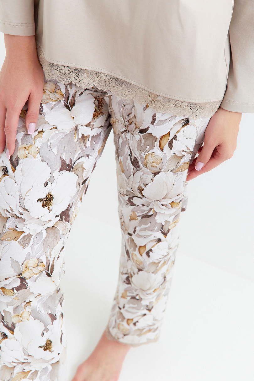 Dámske pyžamo CANA 421 v sivej farbe s kvetmi materiál blúzky - jednoduchý džersej, bavlna 95 %, elastan 5 %; materiál nohavíc - jednoduchý džersej, bavlna 100 voľná, pohodlná blúzka v sivej farbe z príjemného úpletu s elastanom okrúhly výstrih dlhý rukáv dlhé rovné nohavice v béžovej a cerovej farbe s kvetmi spodná časť blúzky a nohavice nohavíc sú zdobené jemnou čipkou
