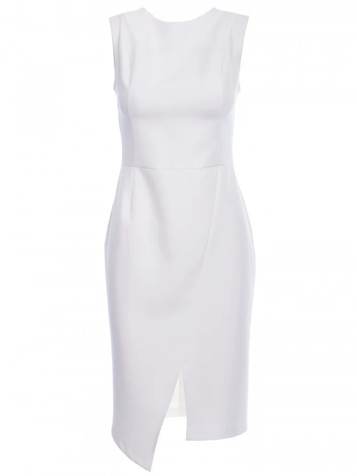 95% polyester 5% elastan Jemné a klasické. Tieto šaty bez rukávov, obopínajúce postavu, s umelým obalom sú vhodné na deň aj na noc. DETAILY VÝROBKU: tkaná tkanina obopínajúca postavu šaty ceruzkového strihu s umelým obalom bez rukávov dĺžka pod kolená asymetrický rozparok vpredu bez podšívky skryté zapínanie na zips Naša modelka má 171 cm a nosí veľkosť S VEĽKOSŤ S M L XL XXL A 35 cm 36 cm 37cm 38cm 39cm B 43cm 45cm 47cm 49cm 51cm C 35cm 37,5cm 40cm 42,5cm 45cm D 46cm 48cm 50cm 52cm 54cm E 104cm 104,5cm 105cm 105,5cm 106cm