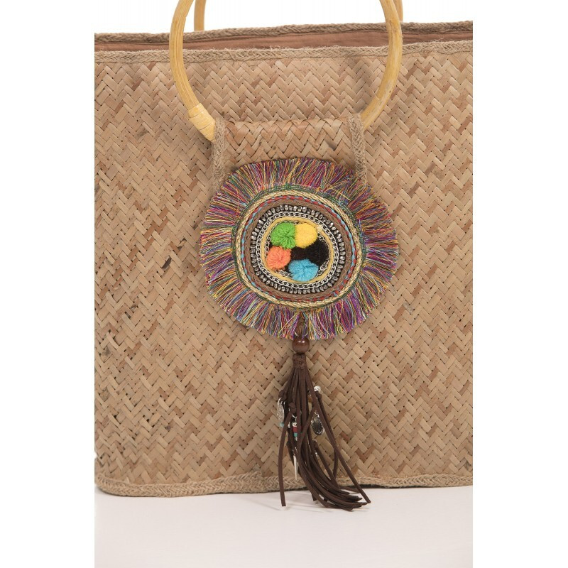 Plážová taška z rafie s bambusovými prútikmi. Vnútri podšívka a zdobená predná časť. Ideálna na použitie toto leto. Piesková farba.