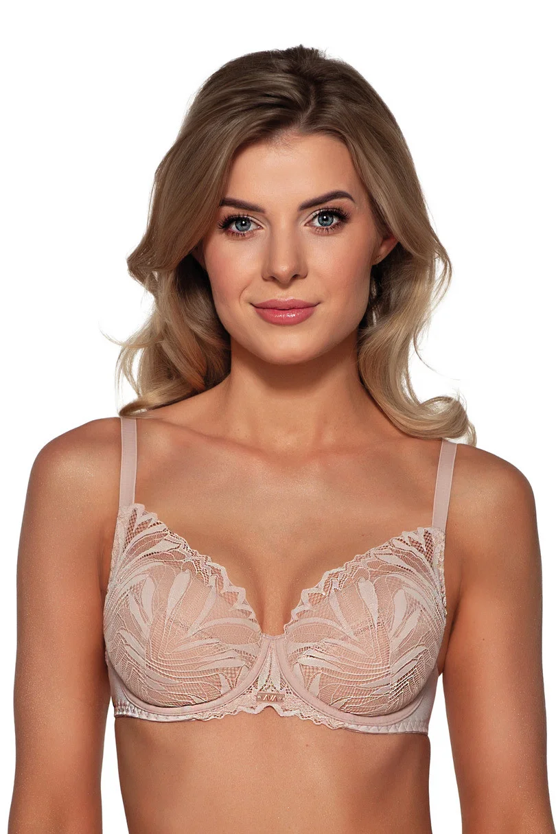 Podprsenka s vystuženými push-up košíčkami a mäkkými vypchávkami je celá pokrytá zložito tkanou čipkou. Jemne prehnané košíčky a ozdobný mostík nádherne zvýrazňujú dekolt. Teplá béžová a ušľachtilá čierna na telovej pene pôsobia mimoriadne vkusne, zatiaľ čo jemná ecru očarí svojím pôvabným šarmom. Na doplnenie súpravy si nezabudnite vybrať nohavičky typu tangá alebo klasické plné nohavičky. Zloženie:Podprsenka - 88 % polyamid, 8 % bavlna, 4 % elastan
