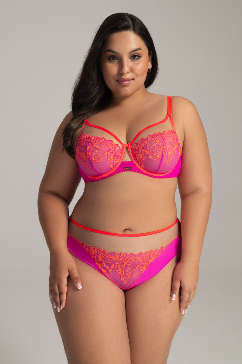 Mäkká podprsenka, dizajn K-1396 AV 2162 Flamingo Soft - neónový hit, ktorý nikdy nevyjde z módy! Výrazná ružová farba tohto modelu vás určite chytí za srdce. Mäkké košíčky dokonale modelujú poprsie a zároveň poskytujú stabilnú oporu a krásne odhaľujú dekolt. Kvetinová výšivka v intenzívnych farbách sa tiahne po prsiach a dodáva celku jemnú zmyselnosť. Oranžové lemovanie, tunely a ramienka v kombinácii s fuksiovým obvodom zdôrazňujú divoký charakter podprsenky a zaručujú pohodlie pri nosení. Lákavé priehľadné prvky v hornej časti košíčkov a umne navrhnuté nohavičky a podprsenky lákajú fantáziu. Odvážte sa na farebnú extravaganciu! Zloženie: 88 % polyamid, 8 % bavlna, 4 % elastan